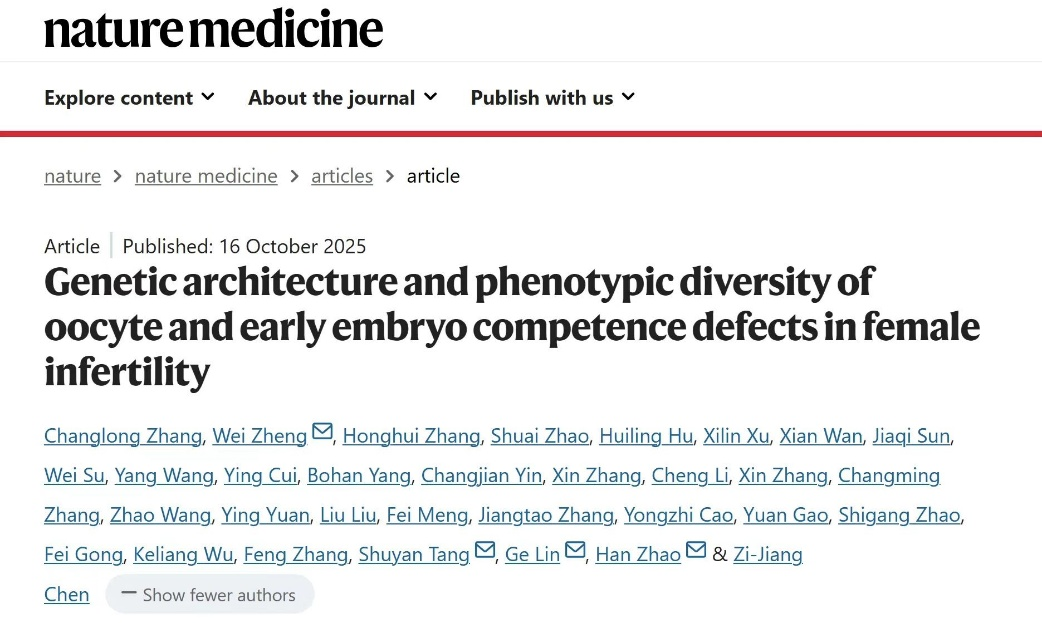 2025年10月16日,中南大学湘雅基础医学院林戈研究员与山东大学陈子江院士、赵涵教授、中南大学生命科学学院郑伟副教授和上海交通大学医学院唐淑妍副研究员团队合作,在Nature Medicine(最新五年影响因子:52.4)期刊发表题为“Genetic architecture and phenotypic diversity of oocyte and early embryo competence defects in female infertility”的研究论文。该研究基于大规模专病队列,率先构建了卵子及胚胎发育潜能缺陷(OECD)的六亚型分型体系,并绘制了首张亚型特异性遗传图谱,不仅为相关疾病的个体化检测路径设计提供了分子基础,也为临床精准分型诊断提供了关键的循证依据。