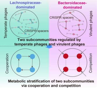 尽管人类微生物组计划等大型项目已构建起丰富的肠道基因组资源,揭示了健康人群常见的肠型,但维持肠道稳态的分子机制仍不清晰。噬菌体通过捕食、基因转移和代谢调控深刻影响微生物生态。肠道细菌基因组中的CRISPR间隔区记录了噬菌体的侵染历史,有助于解析细菌间的互作网络。然而,传统二代测序技术难以准确恢复高度重复的CRISPR序列。本研究采用的新技术提供了高质量的基因组数据,为重建微生物互作网络发挥了关键作用。通过整合CRISPR间隔区分析与基因组代谢模型,研究团队清晰区分出两种截然不同的细菌间相互作用模式:(1)共生模式——以毛螺菌科为主的群落,与温和噬菌体相关,特征为代谢交叉互养;(2)拮抗模式——以拟杆菌科为主的群落,与烈性噬菌体相关,特征为资源竞争。这两种网络结构在炎症性肠病和肥胖中均受到破坏,凸显了它们在生态系统稳定性中的重要作用。